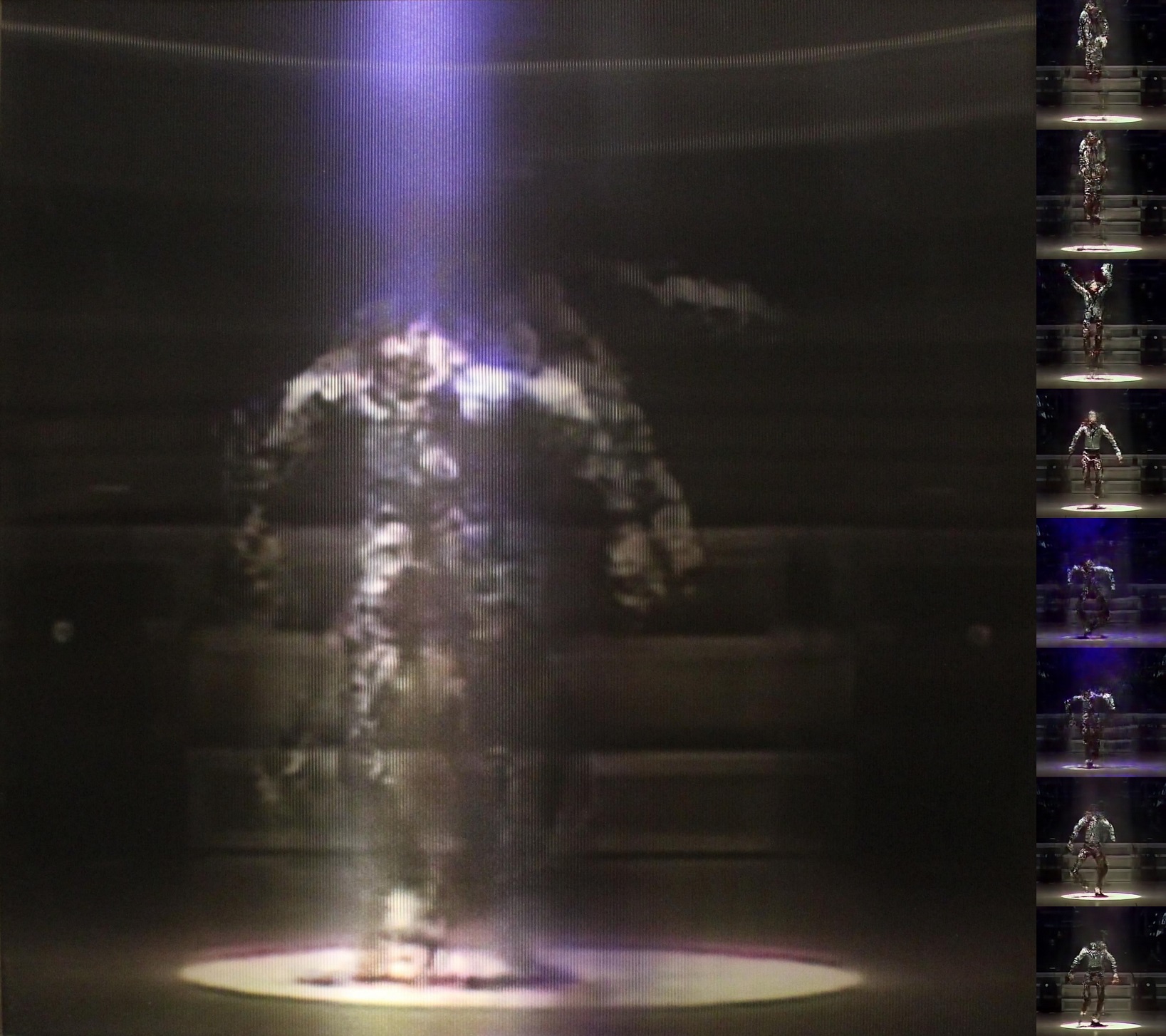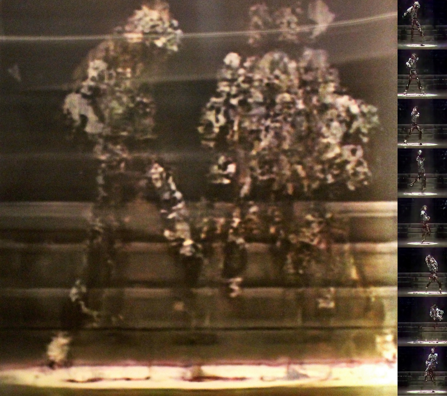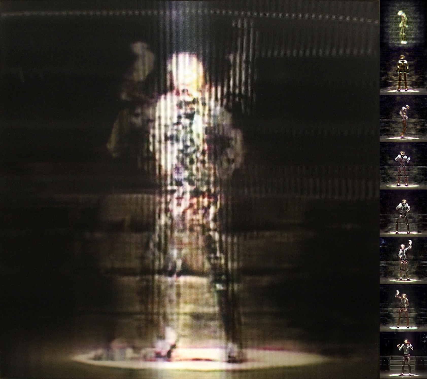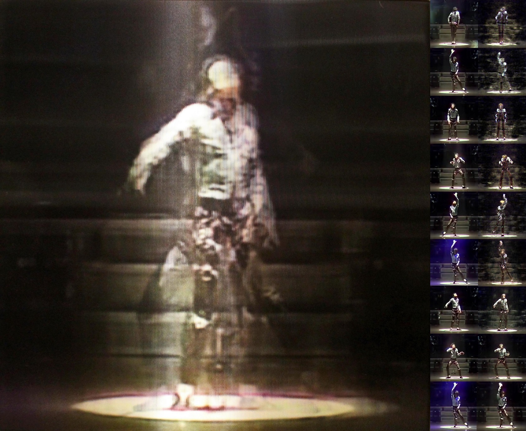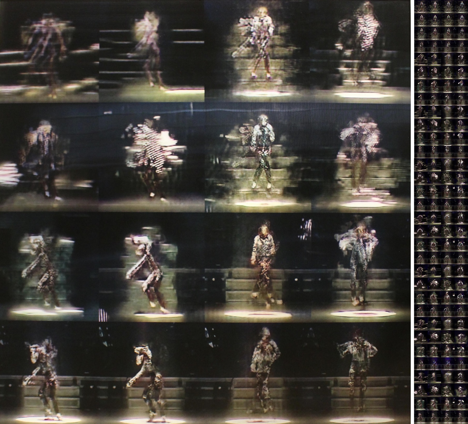MJ X BTS 프로젝트 2. 1988년 웸블리 스타디움에서 마이클 잭슨의 공연을 AI가 학습하는 과정을 시퀀스로 나타내었다. 총 40기가바이트에 이르는 학습 모델들이 영상을 분석하고 재현해내는 과정을 시퀀스로 나타내었다. 처음에는 원시적인 동작만이 어둠속에 존재하지만, 학습의 결과에서 점차적으로 무대, 조명, 표정, 의상의 디테일에 눈을 뜨는 과정을 볼 수 있다.